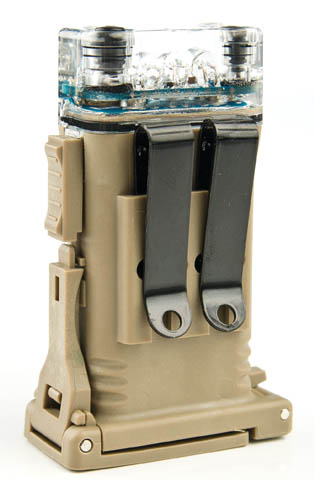 Powered by 2 common AA batteries, Velux™ 5 uses the most common power source available anywhere in the world. Velux™ 5 can be attached to PALS webbing, belts, or uniform by using the supplied locking spring clips.